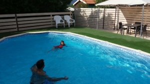 במתחם בריכת שחייה מרעננת ונעימה לימי הקיץ החמים, עמדת מנגל, ספסלים ונדנדות מול הנוף.